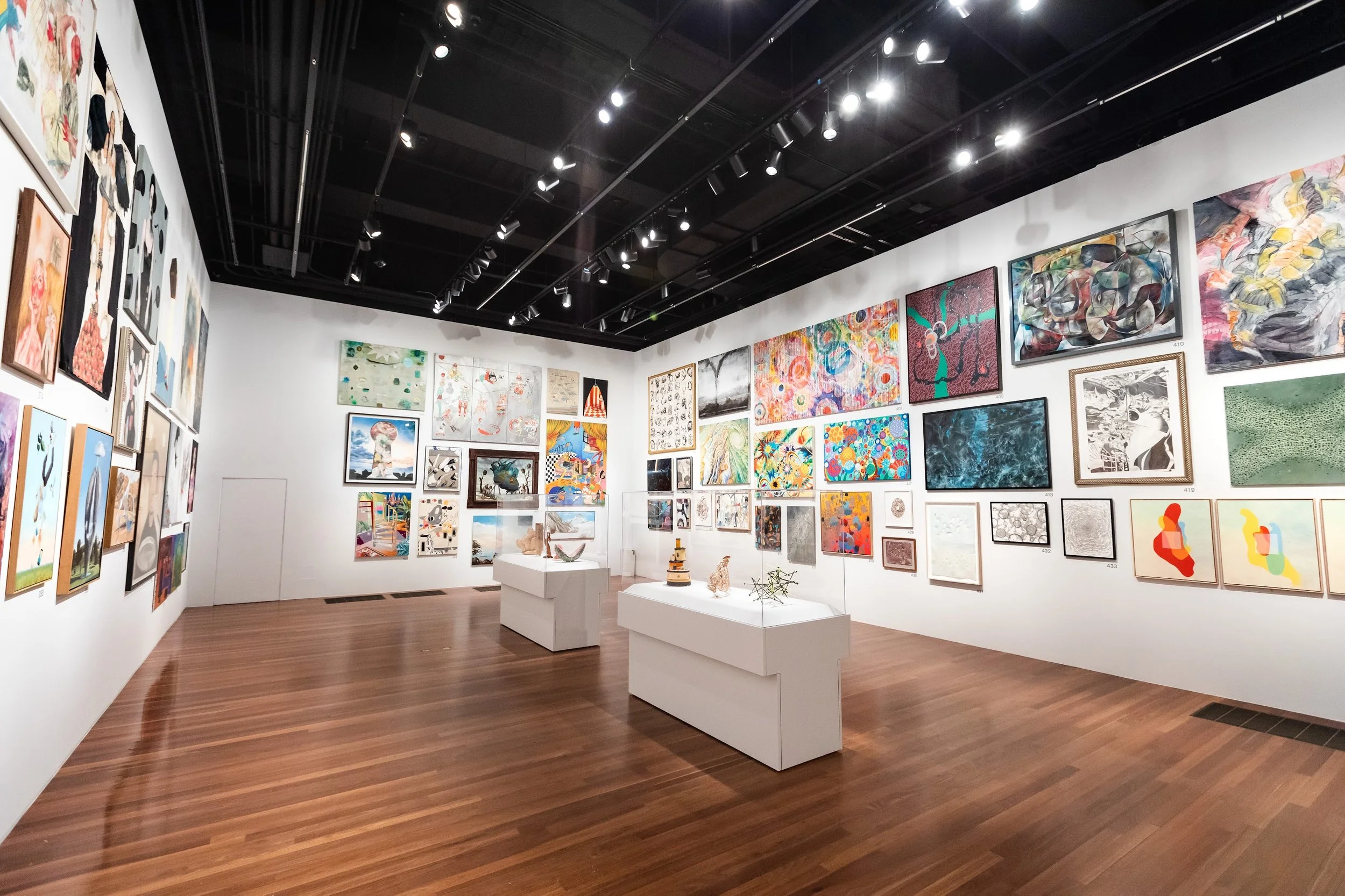 Works of art in The de Young Open are hung “salon-style,” installed edge to edge and floor to ceiling, which enables a maximum number of works to be displayed. The de Young filled the 12,000-square-foot Herbst Exhibition Galleries with 877 artworks by 762 Bay Area artists in The de Young Open.