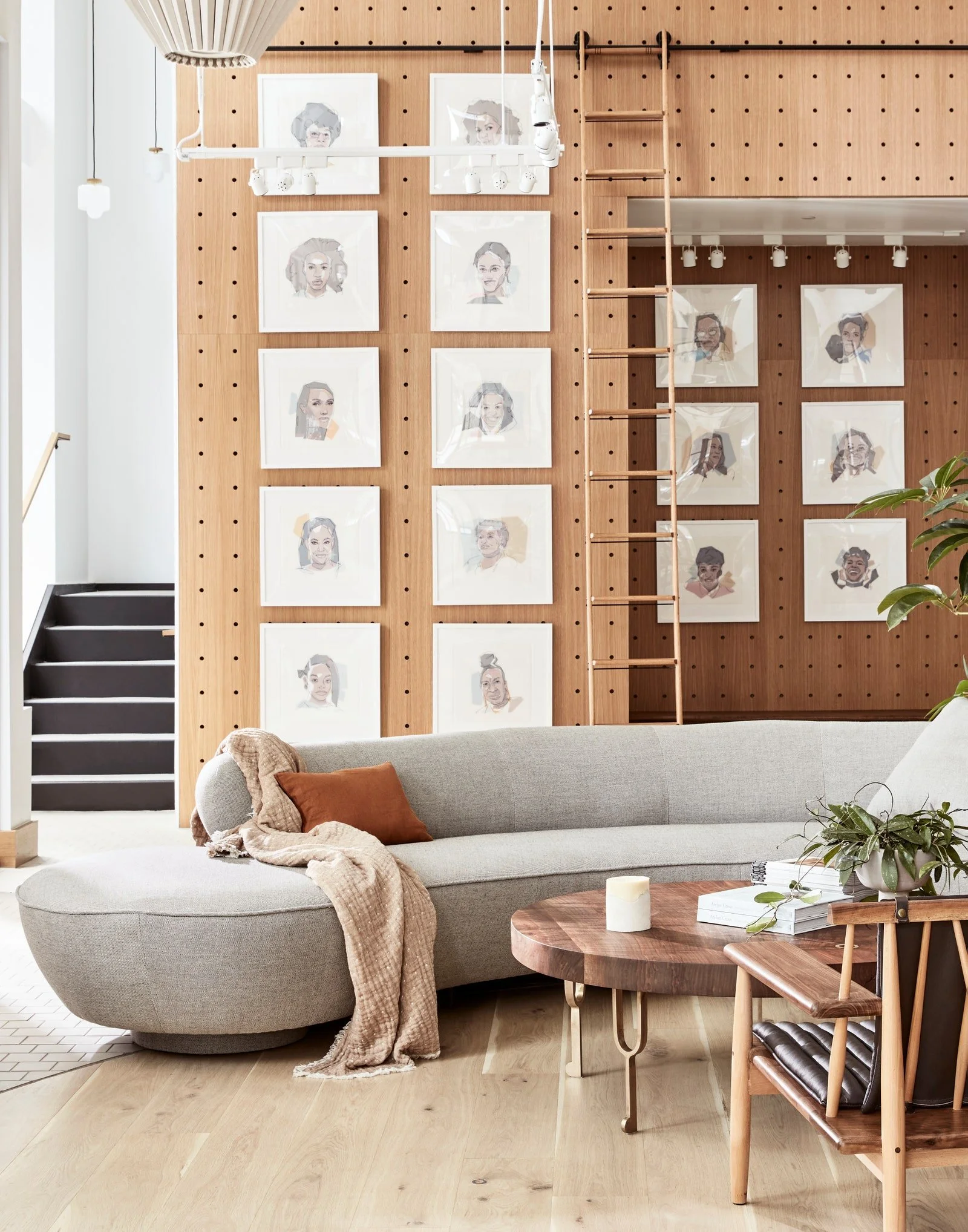 Inspired by the community’s vibrancy, a move to Oakland infused new life into Lopez’s portraits, which are known for their unique use of line, shape and color. Sweet July tapped the visionary to create the Black Icon Wall at SJ’s flagship store, which features 17 portraits of female trailblazers like Meghan Markle, Iman and Vice President Kamala Harris.