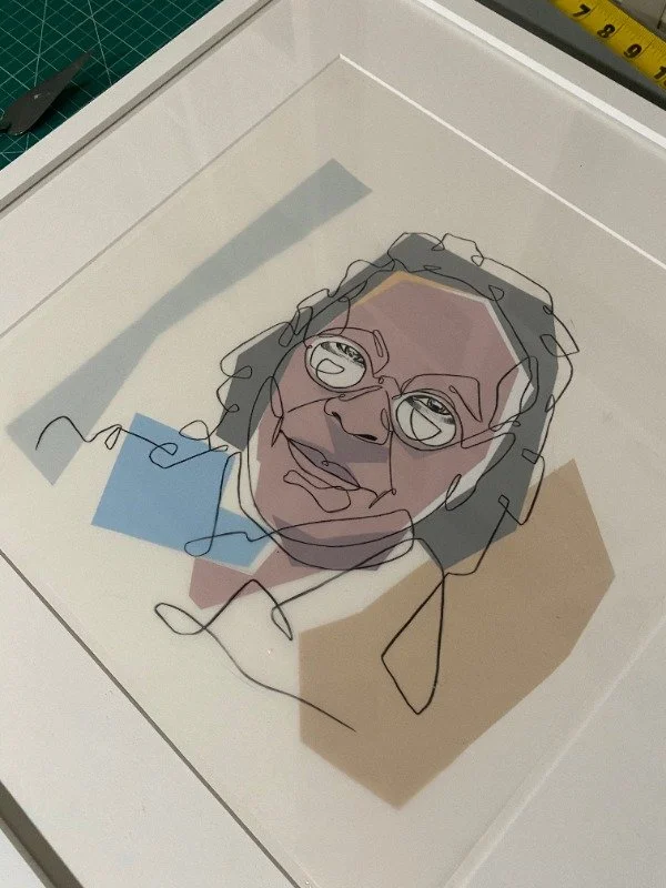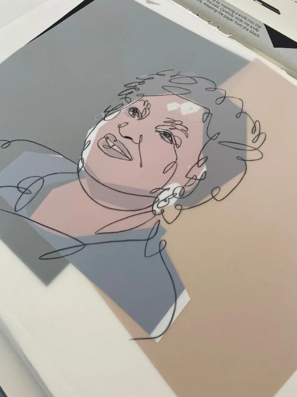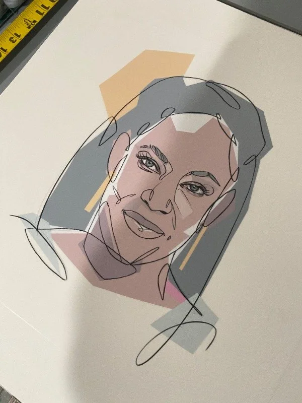 My process is a mixed media variant of my oil portraiture. I start by sketching the portrait in freehand over a thin sheet of semi transparent paper. I then begin cutting shapes and contours from construction and textured papers to make up the color aspects of the portraits. There is a lot of trial and error involved at this stage but this is the fun part. The final pieces are multi-layered paper with a final pastel quick sketch creating a unique portrait style fitting of the amazing subjects I am representing.